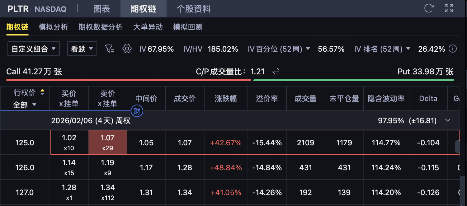支付权利金 1.05 美元/股 该 Put 用于在 PLTR 出现大幅下跌时提供保护,从而锁定最大亏损,避免裸卖 Put 的巨大下行风险。