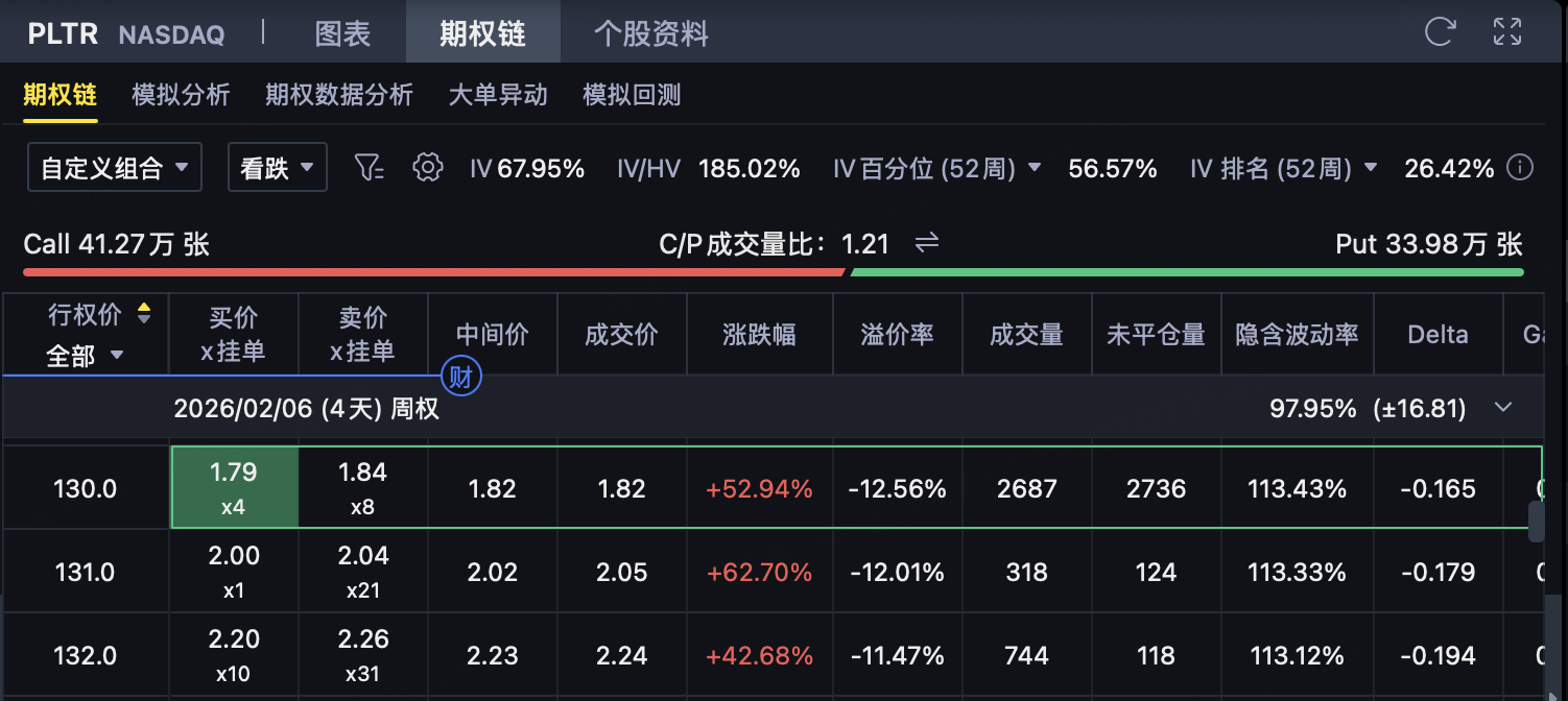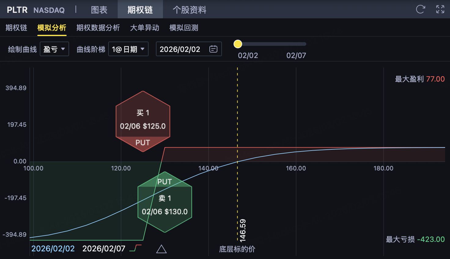 收取权利金 1.82 美元/股 该 Put 更接近当前股价,是 Put 端的主要权利金来源。只要 PLTR 到期价格 ≥ 130 美元,该 Put 将完全失效,权利金全部收入。