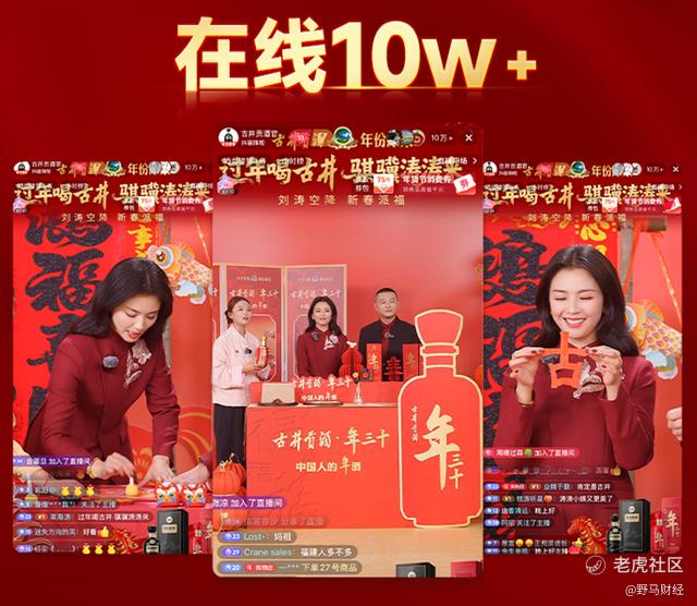 当晚 20:00,古井贡酒抖音官方旗舰店直播间准时拉开帷幕。主持人王小川热力开场后,刘涛身着喜庆穿搭惊艳亮相,直播间热度瞬间攀升,开播5 分钟在线人数便突破 10 万+,弹幕里满是对刘涛的欢迎和对年酒的期待。“过年喝古井” 的关键词持续刷屏,热闹得如同一场线上新春派对。
