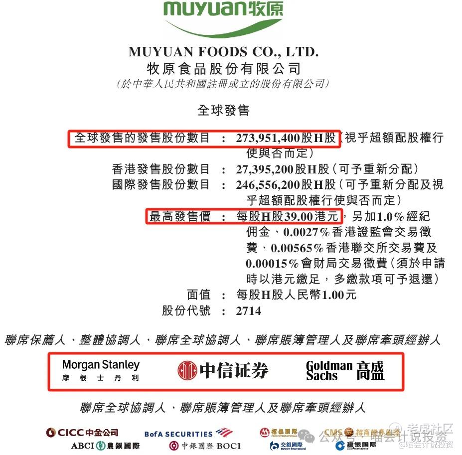 发行价:2024年静态PE13.9倍,2025年动态PE12.2倍,按照今天A股收盘价45.10人民币折价率为23%,港股畜牧业通常不到10倍PE,H股折价率通常在20%-28%,基本就是吃干抹净(4分)!