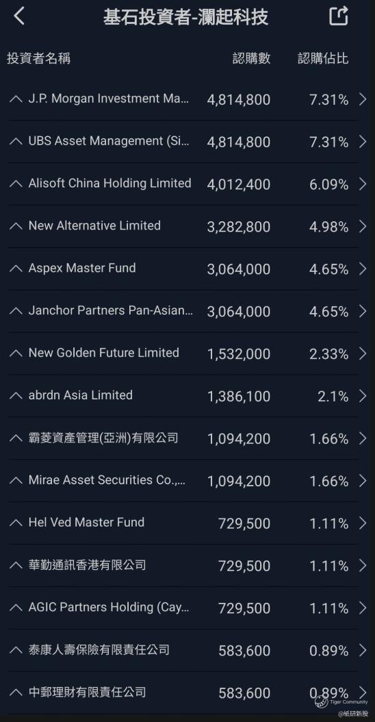 18,占比49.82%,基石阵容很强大,包括J.P.Morgan、UBS、阿里巴巴、泰康人寿等一众顶级外资本
