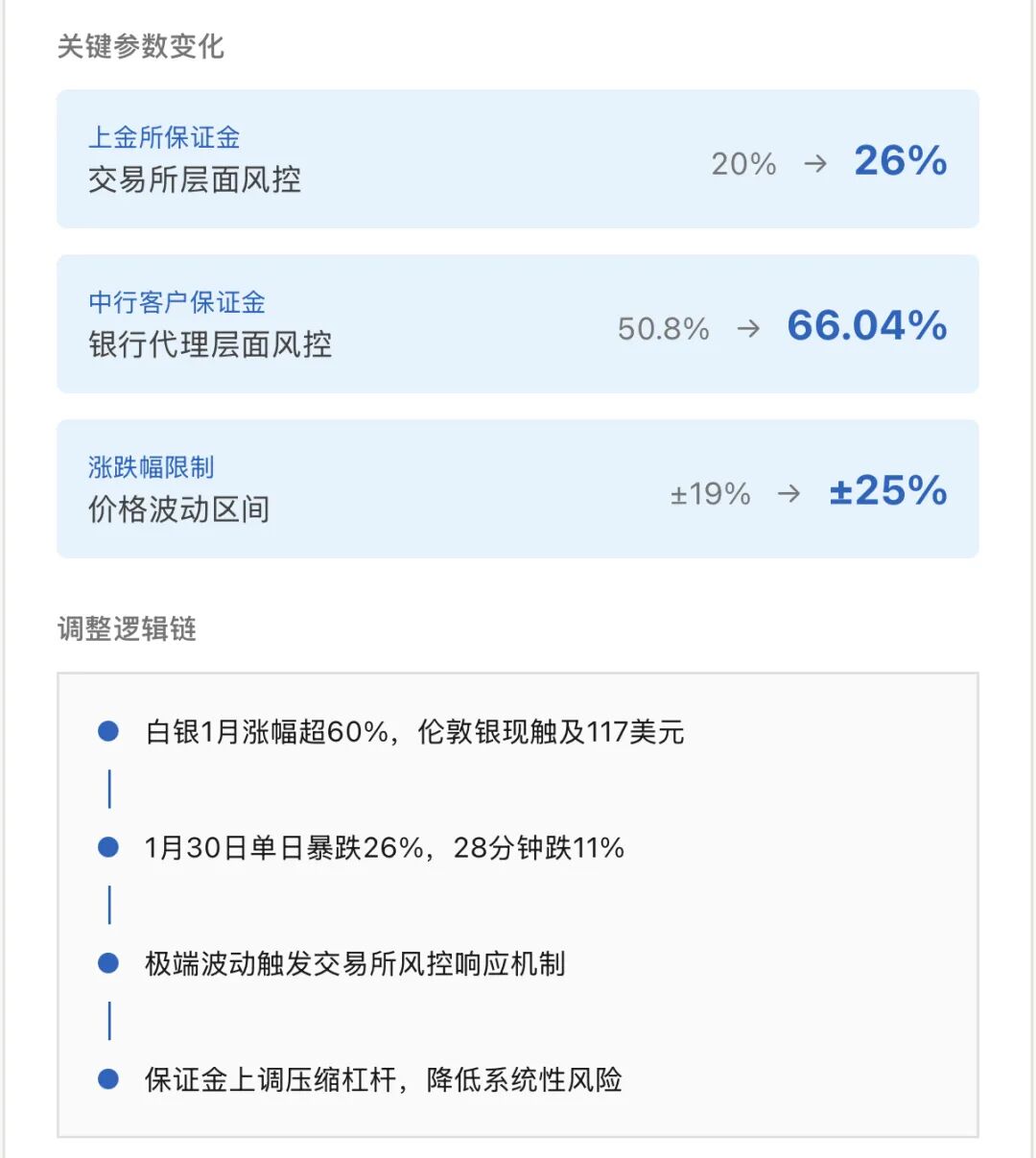 1月30日凌晨,白银在28分钟内暴跌超11%,全天跌幅一度超过26%,演绎了教科书级别的多空绞杀。在这种波动环境下,交易所持续提高保证金比例、扩大涨跌幅限制,本质上是在为极端行情预留缓冲空间。
