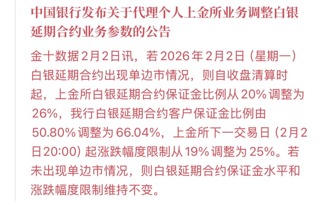 2月2日,中国银行发布代理个人上金所业务白银延期合约参数调整公告。