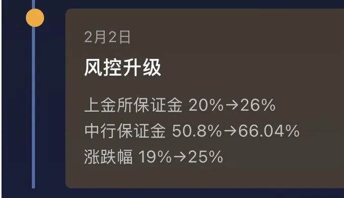 回溯时间线,1月29日中行刚将客户保证金从48.26%上调至50.80%,上金所涨跌幅从18%扩至19%。