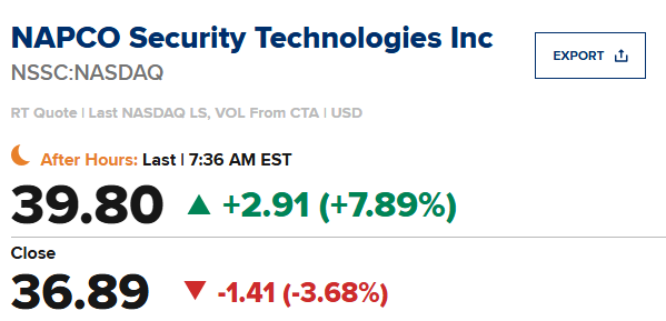 Napco Security Systems(NSSC)第二季度每股盈利0.38美元,比市场预期值0.32美元高出0.06美元;营收同比增长 12.4%至 4820 万美元,市场预期值4780 万美元。
