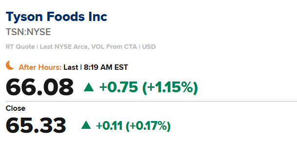 Tyson Foods (TSN)第一季度每股盈利0.97美元,比市场预期值0.95美元高出0.02美元;营收同比增长 5.1%至 143.1 亿美元,市场预期值 140 亿美元。该公司预计 2026 财年营收在 554.9 亿至 565.8 亿美元之间,市场预期值558.4 亿美元。预计 2026 财年公司调整后营业利润为 21 亿至 23 亿美元。