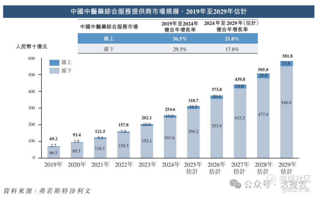 根据弗若斯特沙利文(Frost & Sullivan)的报告,在有利政策、健康消费升级及技术整合的支持下,中国中医药综合服务市场已展现强劲的增长势头。虽然线下分部仍然规模庞大,但线上综合中医药服务市场已成为关键的增长引擎,由2019年的人民币27亿元扩大至2024年的人民币130亿元,复合年增长率为36.5%。