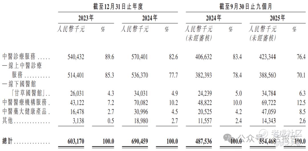 公司的收入主要来源于中医诊疗服务,该业务在2023年和2024年分别占总收入的89.6%和82.6%,构成其核心收入来源。