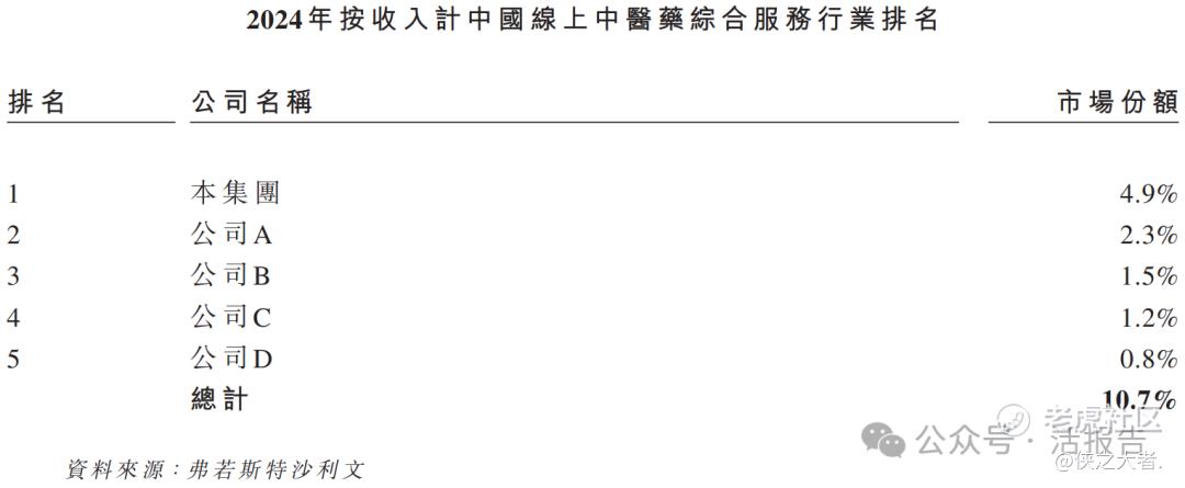 据弗若斯特沙利文报告,按2024年收入计算,中国前五大线上中医药综合服务提供商合计市场份额为10.7%,其中公司以4.9%的市场份额位居第一,是其中规模最大的提供商;公司亦在中国线上中医诊疗服务市场(线上中医综合服务市场的主要细分市场)以16.7%的市场份额位居第一。