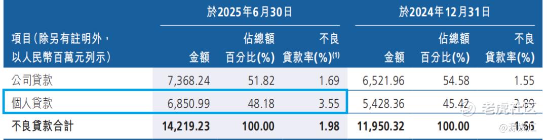 截至2025年6月末,广州农商行的个人不良贷款率从2024年末的2.89%升至3.55%,远高于公司不良贷款率;同期,该行的个人不良贷款余额约为68.51亿元,较2024年末增加约14.23亿元,远高于公司不良贷款8.46亿元的增幅。