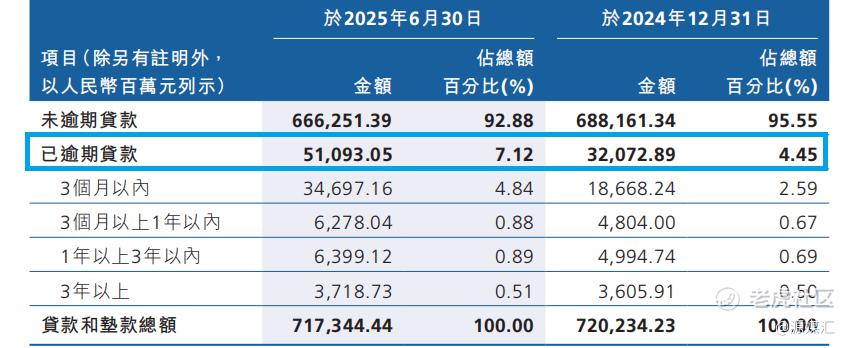 更严峻的是“隐性不良”风险。截至2025年6月末,广州农商行的逾期贷款占比从4.45%升至7.12%;逾期贷款余额达510.93亿元,较2024年末激增190.20亿元,为2017年上市以来最高值,意味着未来仍将有大量逾期贷款面临不良转化压力。