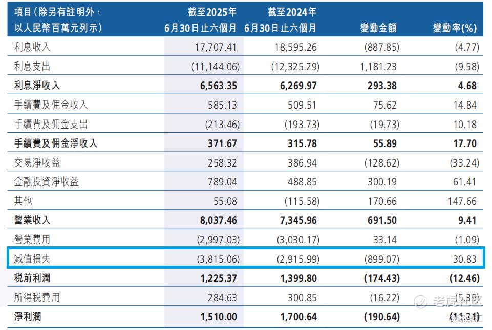 广州农商行2025年上半年的信用减值损失约为38.15亿元,较2024年同期多计提8.99亿元,同比增长30.83%,大量侵蚀了营收增长带来的利润空间。
