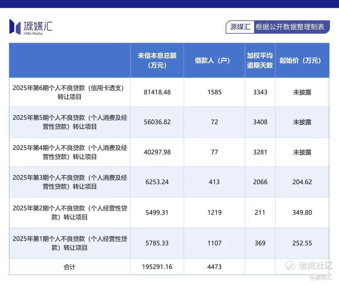 这仅仅是广州农商行2025年挂牌转让的个人不良贷款项目的一部分。银登网信息显示,2025年广州农商行共推出6期个人不良贷款转让项目(含多期重新挂牌),涵盖信用卡透支、个人消费及经营性贷款三大类,合计未偿本息总额达19.53亿元,涉及借款人为4473户。