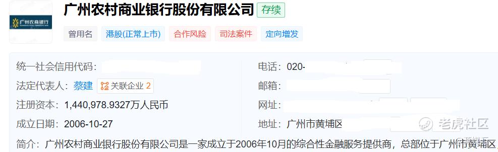 天眼查显示,广州农商行成立于2006年10月,目前注册资本约为144.10亿元,法定代表人是蔡建,他也是该行的党委书记、董事长。