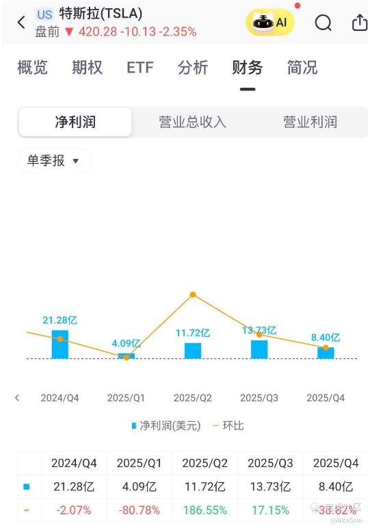 特斯拉Q4 总营收 249.01 亿美元,同比下降了差不多-3%. 从收入结构来看,汽车下滑,能源与服务对冲。他们Q4 分业务收入很清晰,汽车 176.93 亿美元(同比 -11%),能源(发电与储能)38.37 亿美元(同比 +25%),服务及其他 33.71 亿美元(同比 +18%)。这组结构意味着:在汽车交付下行的周期里,特斯拉已经不是单一“卖车公司”的财务形态,能源与服务正在成为真实的对冲器,而不是PPT故事[鬼脸]。