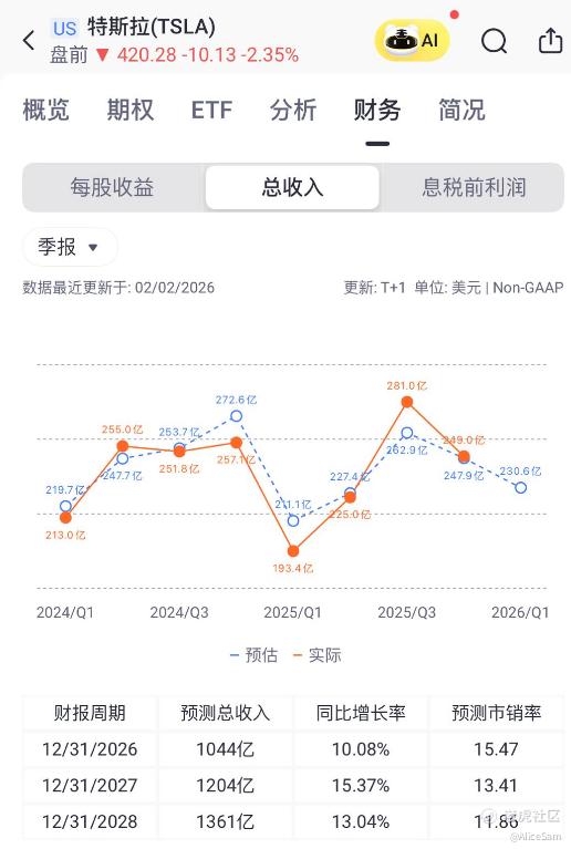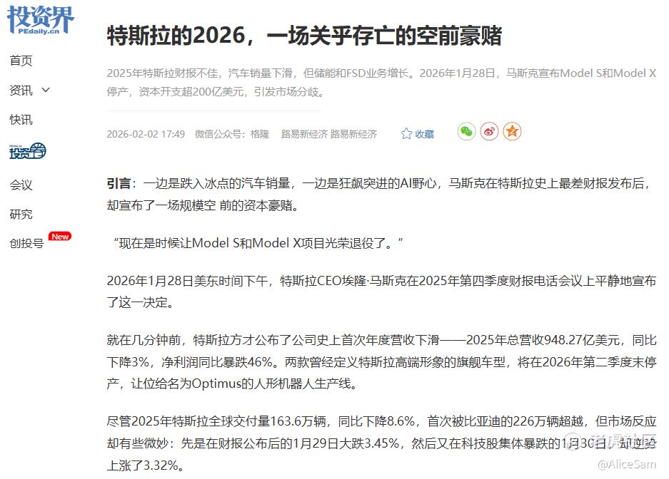 总结来看,特斯拉正在经历一次“换挡期”,从一家纯粹的电动车制造商,通过巨额投入(CapEx 激增)强行切换到物理 AI 赛道(Robotaxi、Optimus)。 “唱衰”的人看的是当下缩水的利润和现金压力,而“看好”的人看的是能源业务的爆发式增长和 AI 的蓝图。只要最悲观的预期(如毛利继续崩塌)没发生,这种“底色”就能支撑它继续讲接下来的故事。