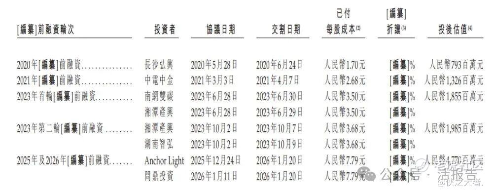 公司上市前经历了5轮融资,在2025年及2026年的上市前融资中,公司的投后估值约为47.7亿人民币。