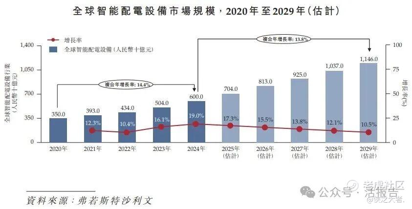 全球智能配电设备行业的市场规模从2020年的约人民币3,500亿元增至2024年的约人民币6,000亿元,期内复合年增长率约为14.4%。预计到2029年全球智能配电设备行业的市场规模将达到约人民币11,460亿元,2024年至2029年的复合年增长率约为13.8%。