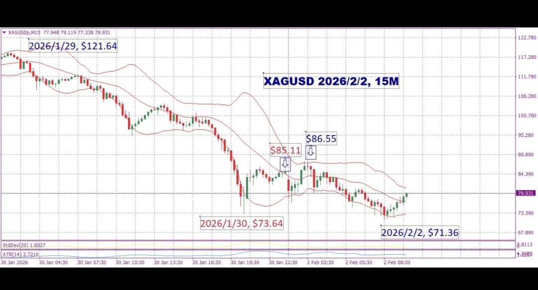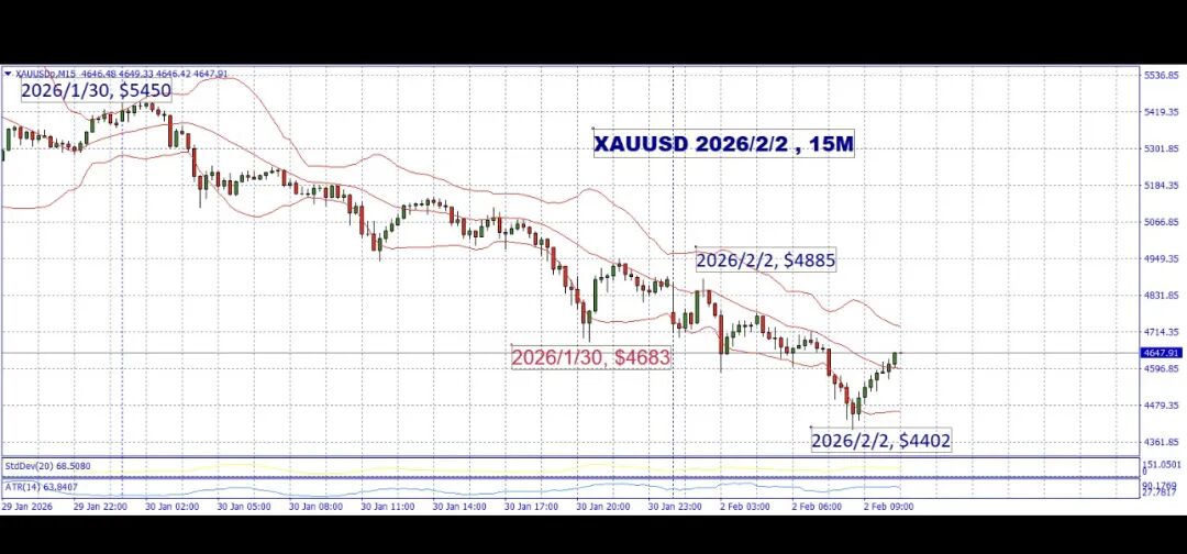 今天黄金和白银在突破上周五收盘价后继续沿15分钟图布林带中轨线下跌。黄金在$4402止跌反弹,白银在$71.36止跌反弹,重上中轨线之上。