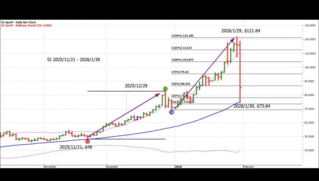 →若以2025/11/21 - 2025/12/29作为第一浪升势来衡量,它的第二浪上升从2025/12/29-2026/1/29,在150%阻力位下跌,回踩12.5%支撑位。