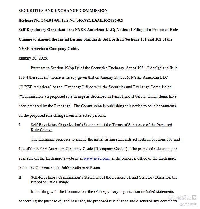 2026年1月29日,纽交所美国板(NYSE American)向美国证券交易委员会(SEC)提交规则修改文件(文件编号:SR-NYSEAMER-2026-02),对《NYSE American公司指南》的初始上市标准的拟议规则变更备案。