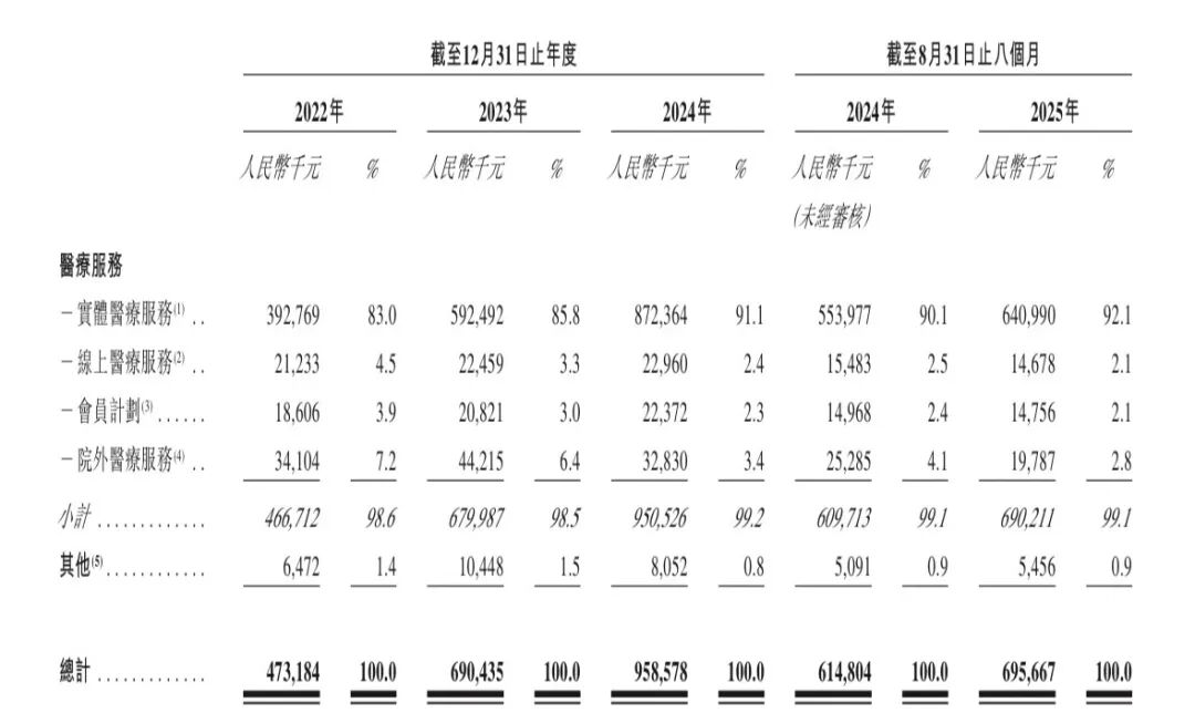 卓正医疗采用线上线下结合的方式运营。实体医疗服务是公司绝对的主营业务,收入占比超过90%;而线上医疗服务收入占比则逐年下滑,2025年前八个月仅占2.1%。