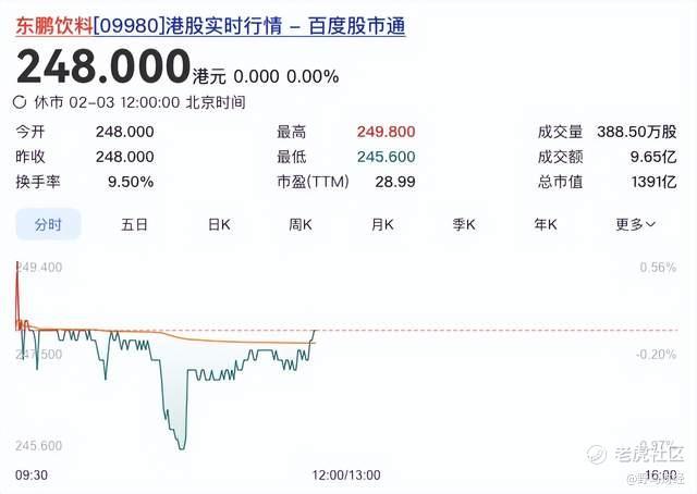 然而,强大的基石阵容并未能阻止股价在上市首日开盘仅微涨0.56%,随后一度跌破发行价。截至收盘,东鹏饮料股价为251.8港元/股,微涨1.53%,总市值1585亿港元。