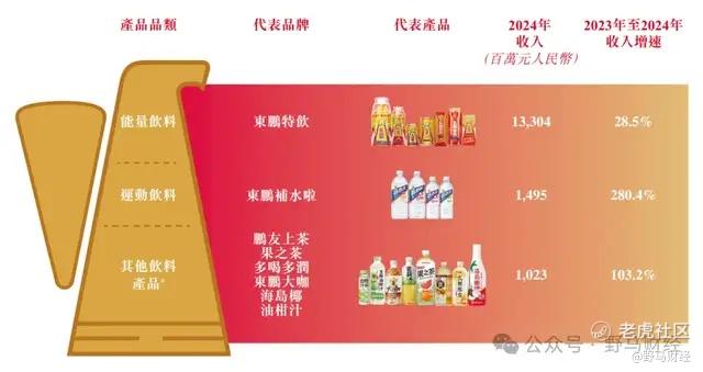 其中,运动饮料“东鹏补水啦”于2023年被划入功能饮料板块,此后,该产品增势迅猛,年营收从2023年的3.93亿元跃升至2024年的14.95亿元,占比从3.5%提升至9.4%。