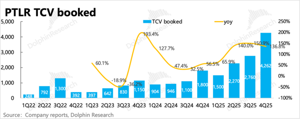 (1)中长期视角关注TCV、RPO、客户数量:四季度TCV(总合同价值)同比增长137%达到42.6亿美金,其中美国商业订单四季度增长67.4%,环比放缓,表明短期新签合同主要在政府端。