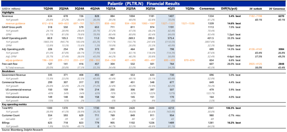 Palantir于美东时间2月2日盘后发布了2025年四季度的业绩。整体来看很不错,基本没啥可挑刺的地方。 $Palantir Technologies Inc.(PLTR)$
