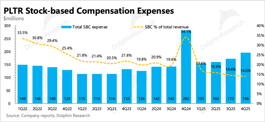 国际企业增长仍然稳定在高个位数,但客户数环比减少3家。上季度海豚君就说过,除了本身需求因素外(经济承压下,欧企用于创新技术上的预算并不充足),欧洲企业对Palantir与美国国防部深度捆绑的操作也有质疑和担忧。因此国际商业市场未来的增长空间,仍然具备高不确定性。