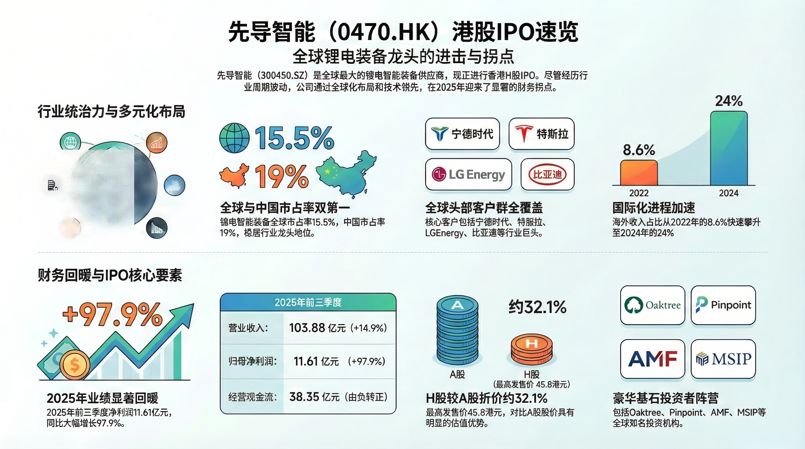 A股光伏锂电装备龙头——先导智能(港股代码:0470)终于来港股上市了!作为全球最大的锂电智能装备供应商,这次H股IPO从2月3日开始招股,2月11日挂牌交易。全球发售9361.6万股H股,香港公开发售占10%,国际发售占90%,最高发售价45.8港元/股。基石投资者有Oaktree、Pinpoint、AMF、MSIP等,阵容较为扎实。