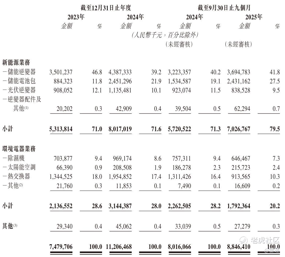 德业股份2025年前9个月来自储能逆变器收入为36.95亿,占比为41.8%;来自储能电池包收入为24.31亿元,占比为27.5%;来自光伏逆变器收入为8.39亿元,占比为9.5%。