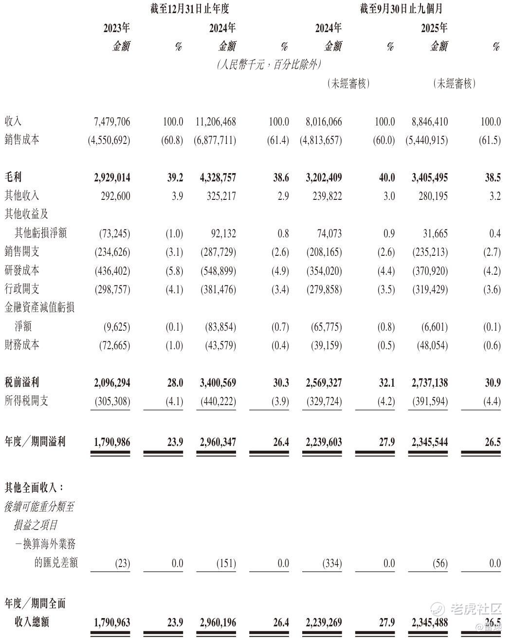 德业股份2025年前9个月营收为88.46亿元,毛利为34亿元,期内利润为23.46亿元,期内利润率为26.5%。