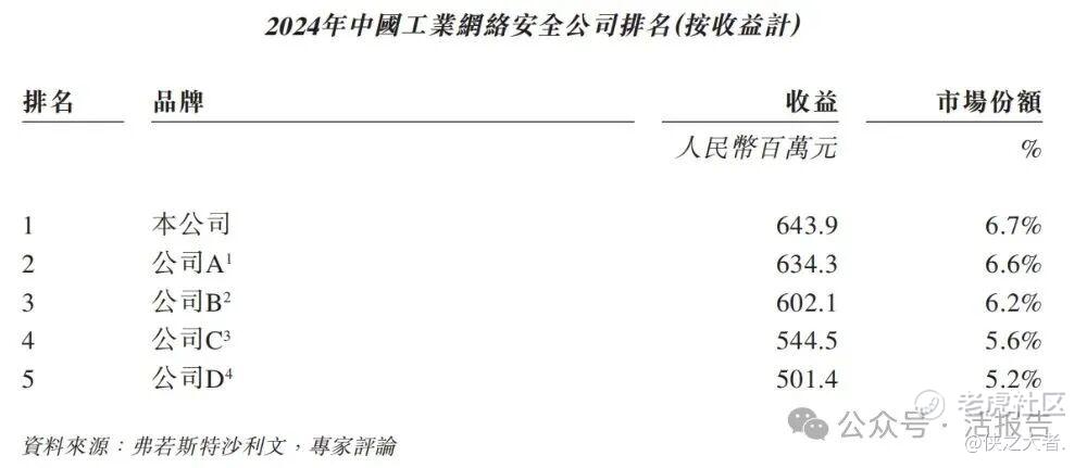 公司是中国一家知名的工业网络安全及能源数智化综合解决方案提供商。根据弗若斯特沙利文的资料,按市场份额计,公司于2024年位居中国工业网络安全市场第一位,整体市场份额为约6.7%,尤其是于中国工业网络安全市场能源领域的市场份额为约8.4%。