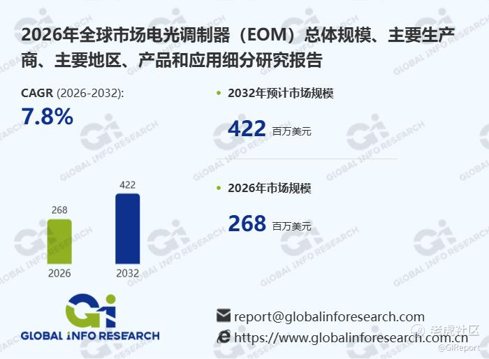 据GIR (Global Info Research)调研,按收入计,2025年全球电光调制器(EOM)收入大约250百万美元,预计2032年达到422百万美元,2026至2032期间,年复合增长率CAGR为7.8%。