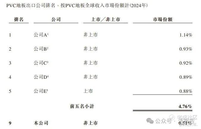 按2024年全球PVC地板销售面积计,公司在中国PVC地板出口制造商中排名第八,市场份额为0.61%,按2024年全球SPC地板销售面积计,公司在中国PVC地板出口制造商中排名第一,市场份额为1.02%。