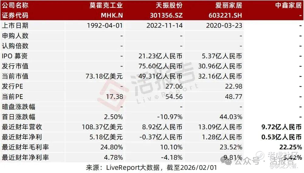 同行业IPO可比公司:莫霍克工业、天振股份、爱丽家居。
