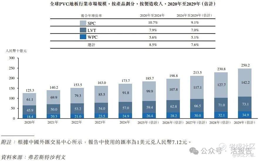 根据弗若斯特沙利文(Frost & Sullivan)的报告,于2020年至2024年,全球PVC地板行业的制造收入从约人民币1,253亿元增加至约人民币1,737亿元,复合年增长率达8.5%。展望2024年至2029年,全球PVC地板行业制造收入预计将从约人民币1,737亿元增加至约人民币2,502亿元,整体复合年增长率预计为7.6%。