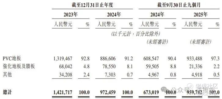 于往绩记录期间,公司的收入主要来自销售PVC地板。公司亦销售强化地板及墙板以及其他产品。于2023年及2024年以及截至2024年及2025年9月30日止九个月,销售PVC地板的收入分别占总收入的92.8%、91.2%、90.4%及97.3%。