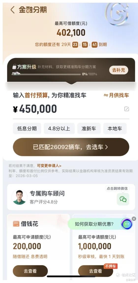 其中,分期购车业务主打低门槛与高额度,最低可至1成首付,最高贷款额度达50万元,月费率低至3厘9(折合年化约4.68%)。