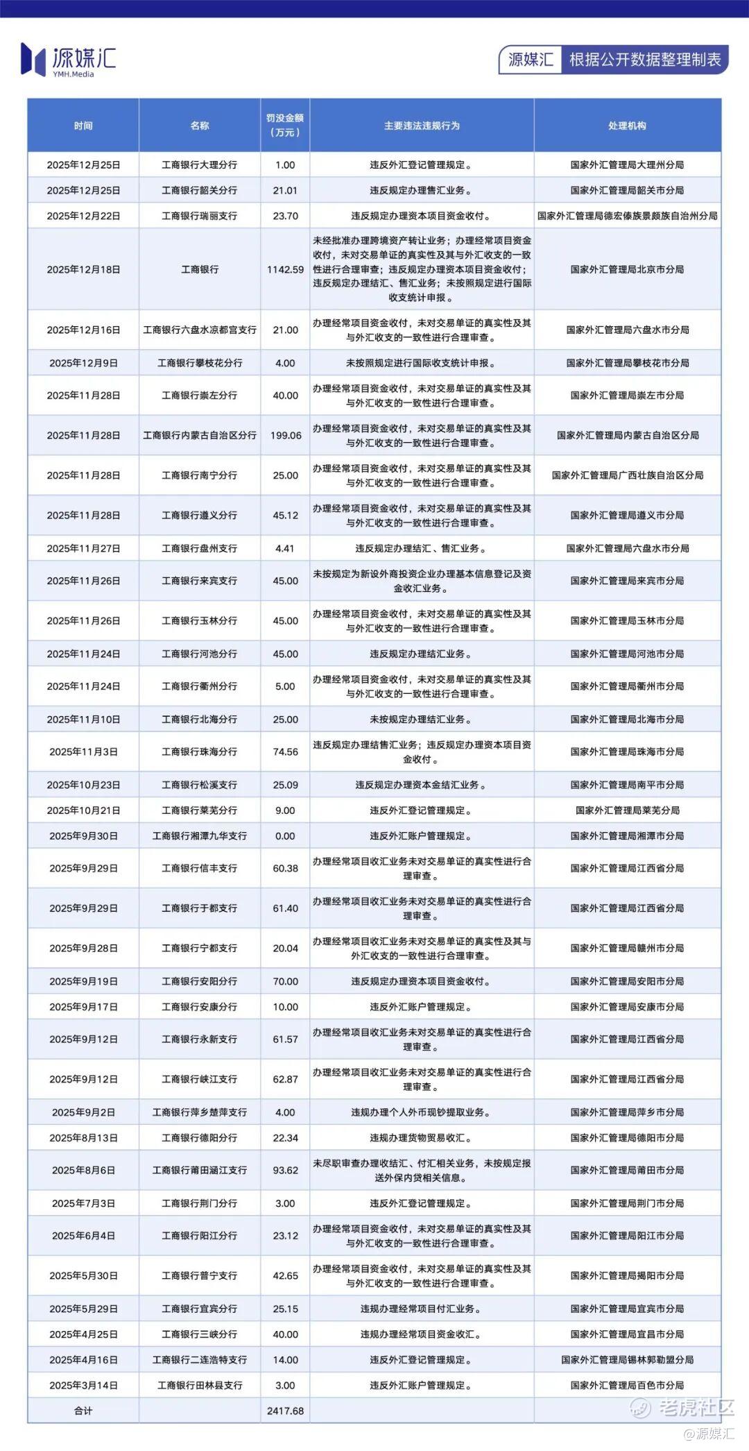 国家外汇管理局及各地分局2025年对工行开出37张罚单,占总罚单数量的27%,罚没金额合计2417.68万元;违规机构从总行到分行再到支行,地域则横跨天南地北:大理、二连浩特、安阳、南宁……
