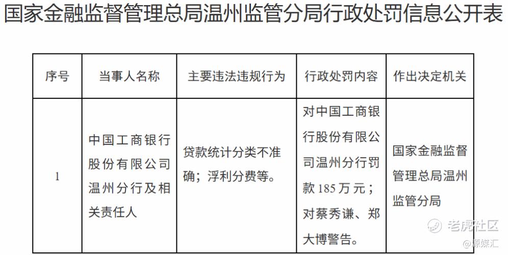 因“受理不符合条件的固定资产贷款申请并发放贷款,严重违反审慎经营规则”,工行西藏自治区分行在2026年1月27日被罚款30万元,一名相关责任人被警告并罚款5万元;因“贷款统计分类不准确;浮利分费”等,工行温州分行在1月23日被罚款185万元,两名相关责任人被警告。