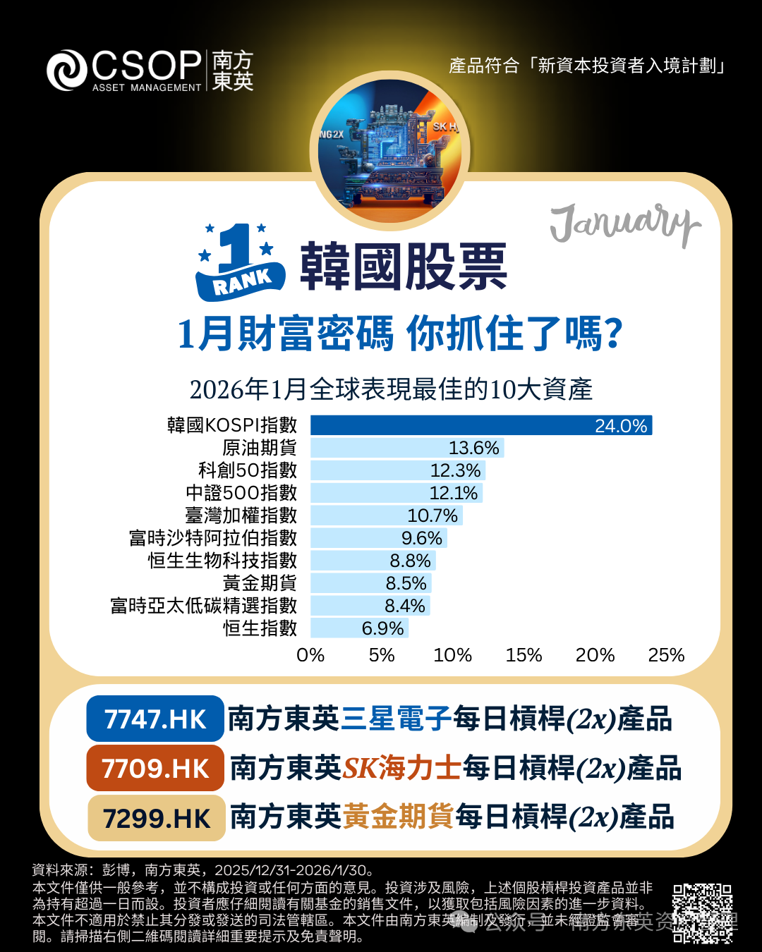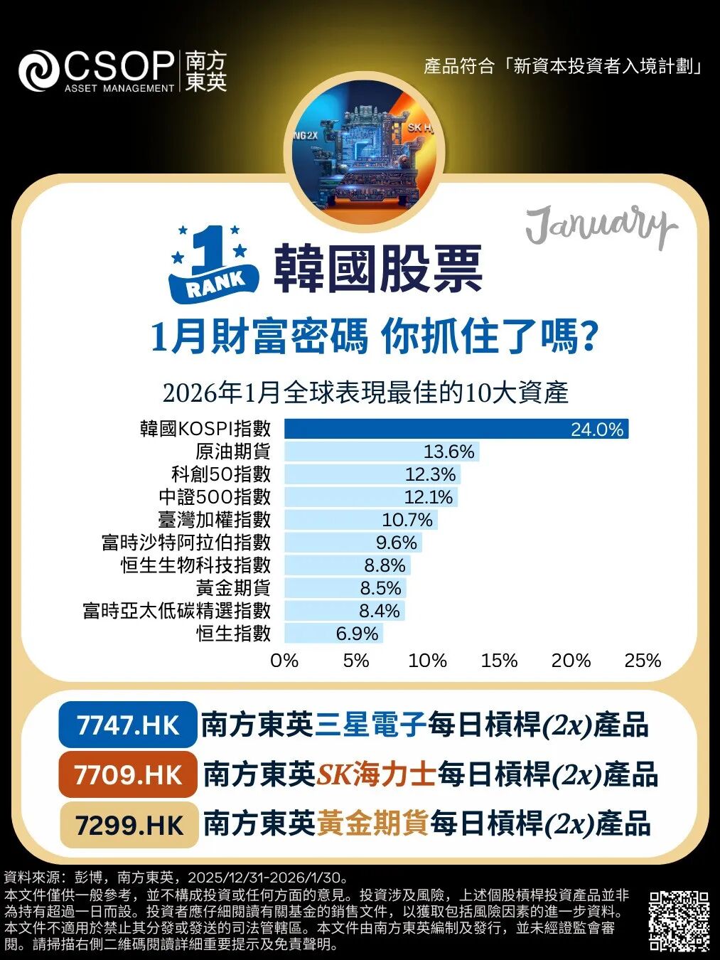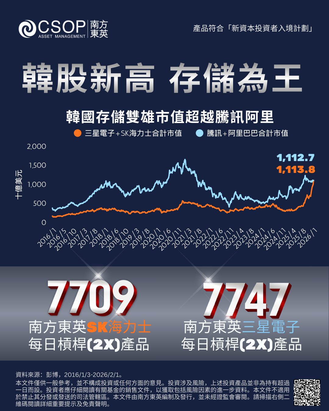 2026年1月市场情绪激昂,尤其韩国半导体股票表现势如破竹,三星电子和SK海力士的创纪录业绩吸引资金流入,图2如今这两只巨头的市值总和超过万亿美元,超过腾讯和阿里巴巴的市值总和。同时黄金强势持续,1月一度冲破5,500美元,南方东英黄金期货每日杠杆(2x)产品(7299.HK)为投资者提供放大黄金势能的简便工具。#三星SK海力士市值超阿里腾讯 #黄金 #南方东英
