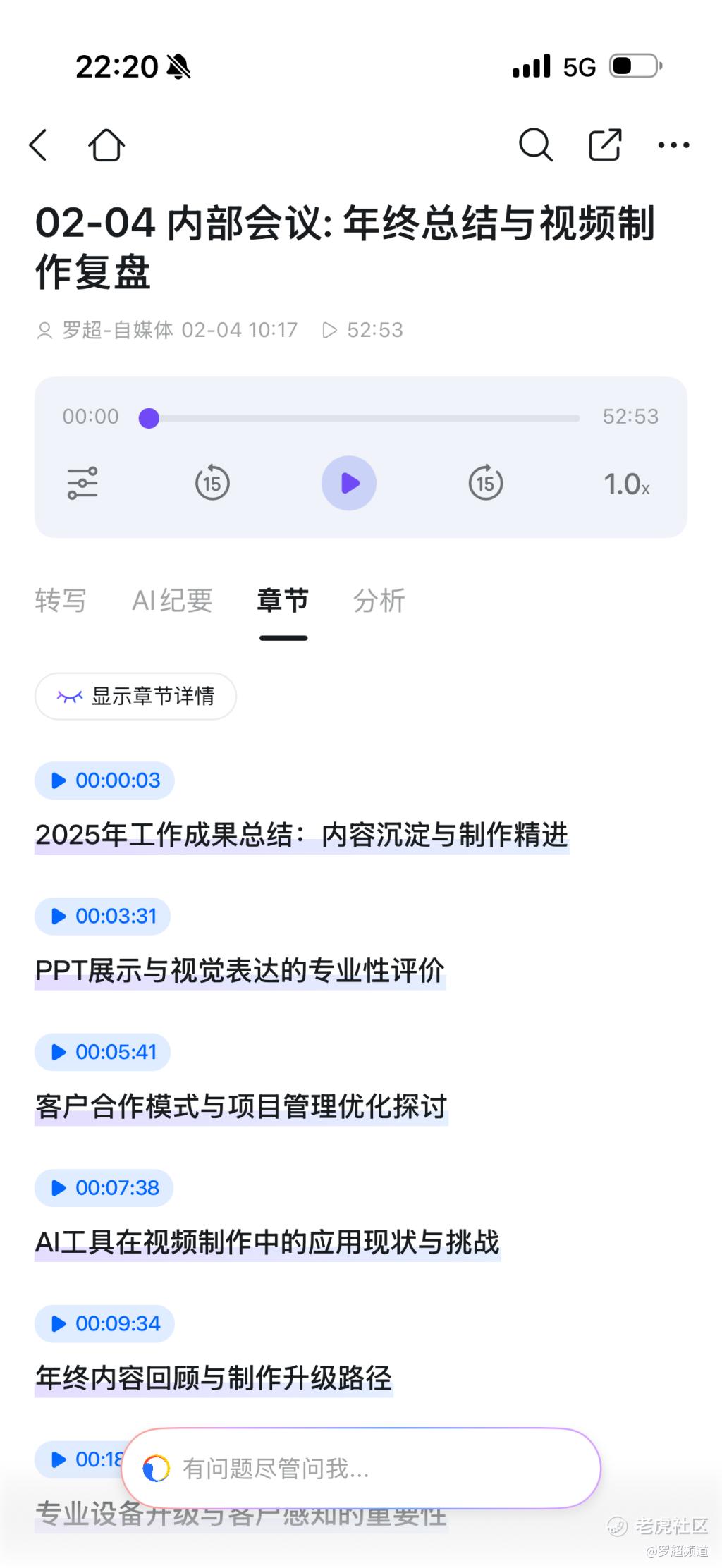 4、AI转录准确率很高,包括AI会议纪要、章节AI分析都有很高的可用性,支持分享。