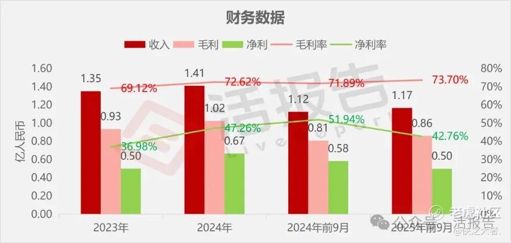 公司是一家平台型医疗器械公司,2024年收入1.41亿元,净利润0.67亿元,毛利率72.62%;2025年前9个月收入1.17亿元,净利润0.5亿元,毛利率73.7%。