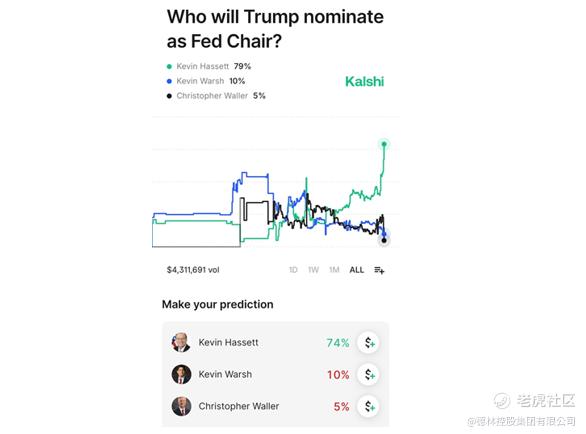 值得大家思考的是,为什么特朗普天天喊让美联储降息的总统会任命一个实质上更倾向于紧缩的鹰派美联储主席?让我们代入到特朗普的角色来分析他的选项。贝森特主导的美联储主席遴选名单中排名前三的是哈赛特、沃什、Waller(现任理事)。2025年12月,在博彩网站Kalshi上,特朗普提名哈塞特为美联储主席的概率飙升至80%,第二名凯文·沃什为10%。