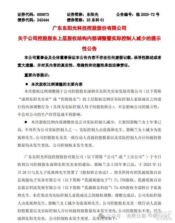 12月29日晚,东阳光发布公告称,郭梅兰与儿子张寓帅签署了《股权转让协议》。
