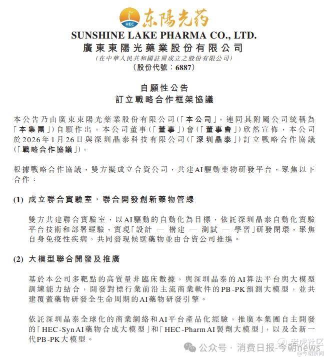 1月26日,东阳光集团旗下的医药板块核心企业东阳光药宣布与晶泰科技达成战略合作,拟砸下数亿元成立合资公司,押注AI药物研发引擎。这是他全面接掌家族企业后的关键动作。