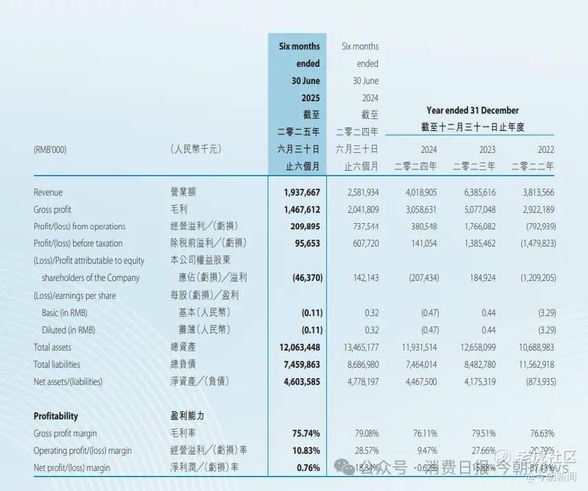 其中,2025年上半年,公司营收19.38亿元,较2024年同期的25.82亿元减少6.44亿元,25%的降幅。扣非后净利润仅1465万元,同比骤降96.9%。归母净利润更是从2024年同期的1.42亿元转为亏损4637万元。